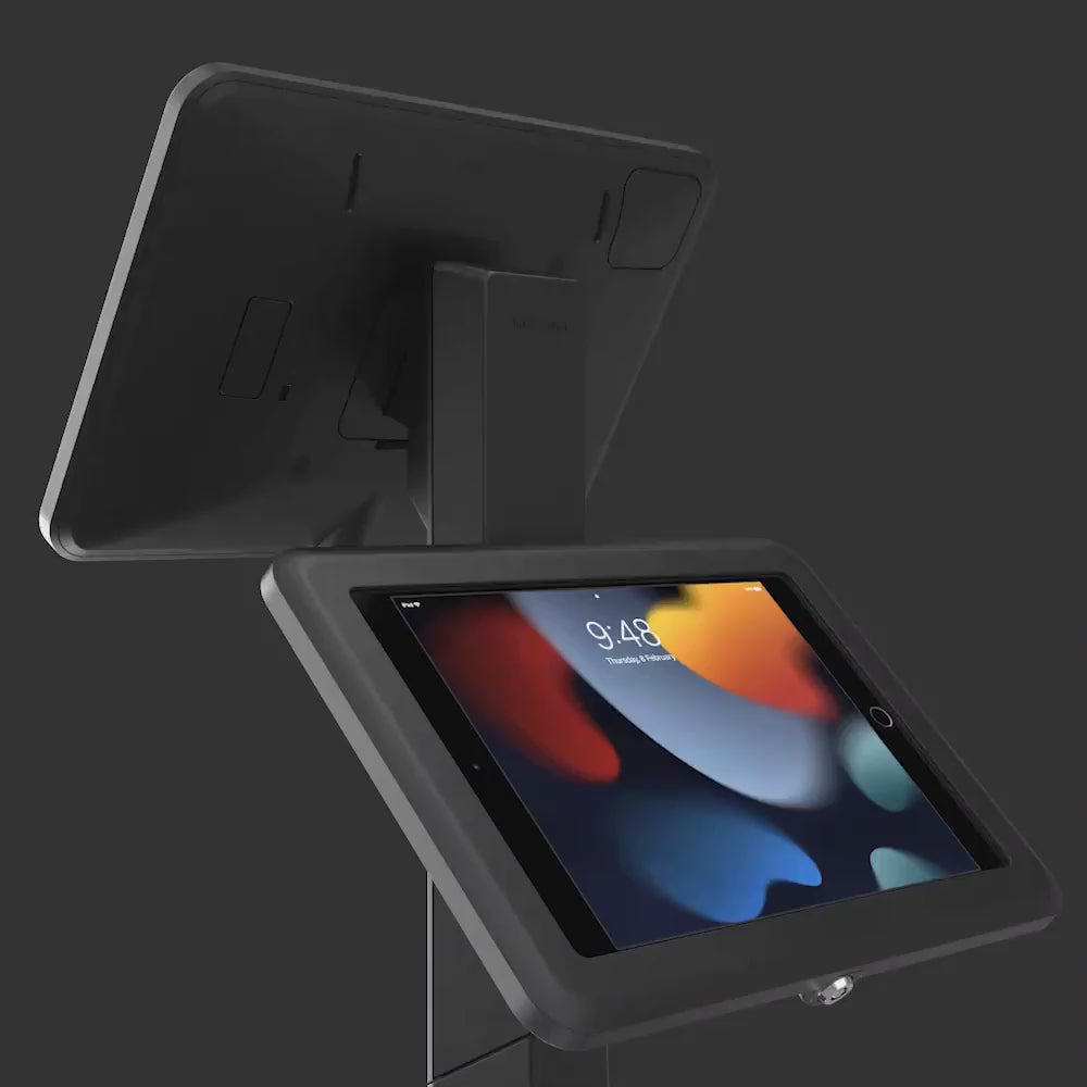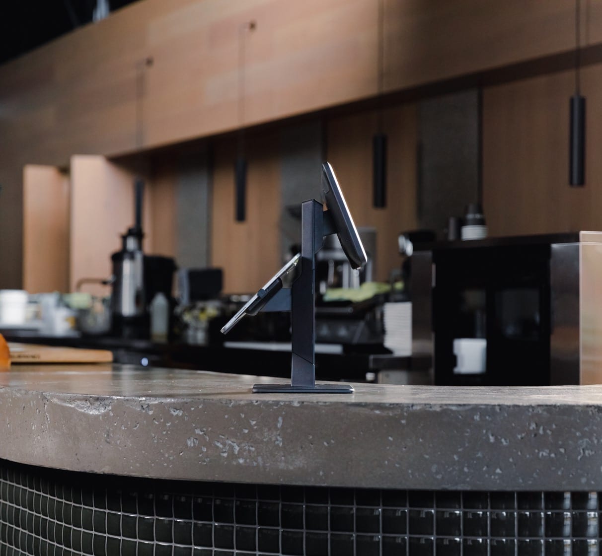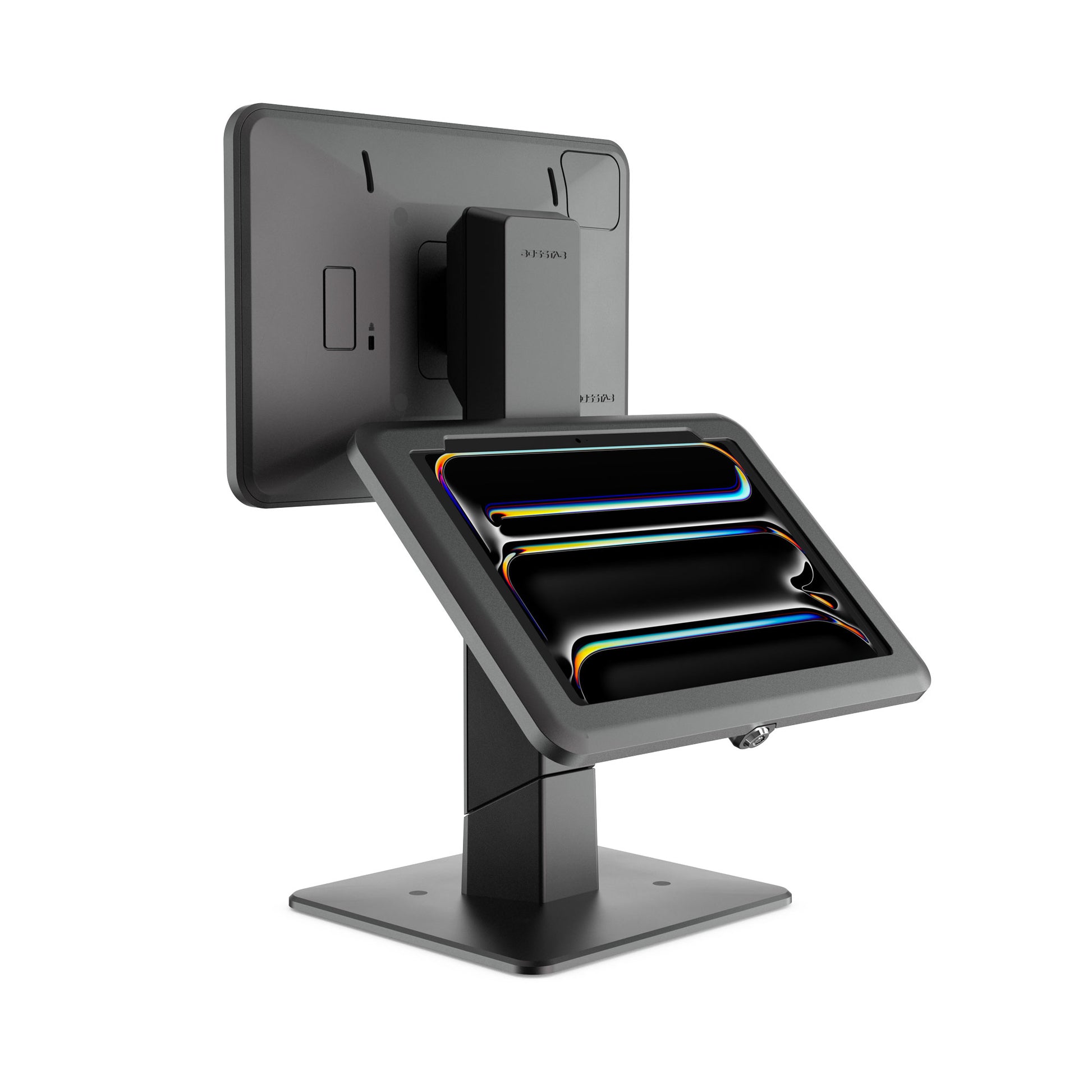 Gemini Dual, tüm tablet modelleriyle uyumlu, 45° ayarlanabilir üst tablet tutucusu, ayaklı ya da vidalı montaj seçenekleriyle, hem personel hem de müşteri yönlü POS sistemleri için tasarlanmış çiftli tablet standıdır.